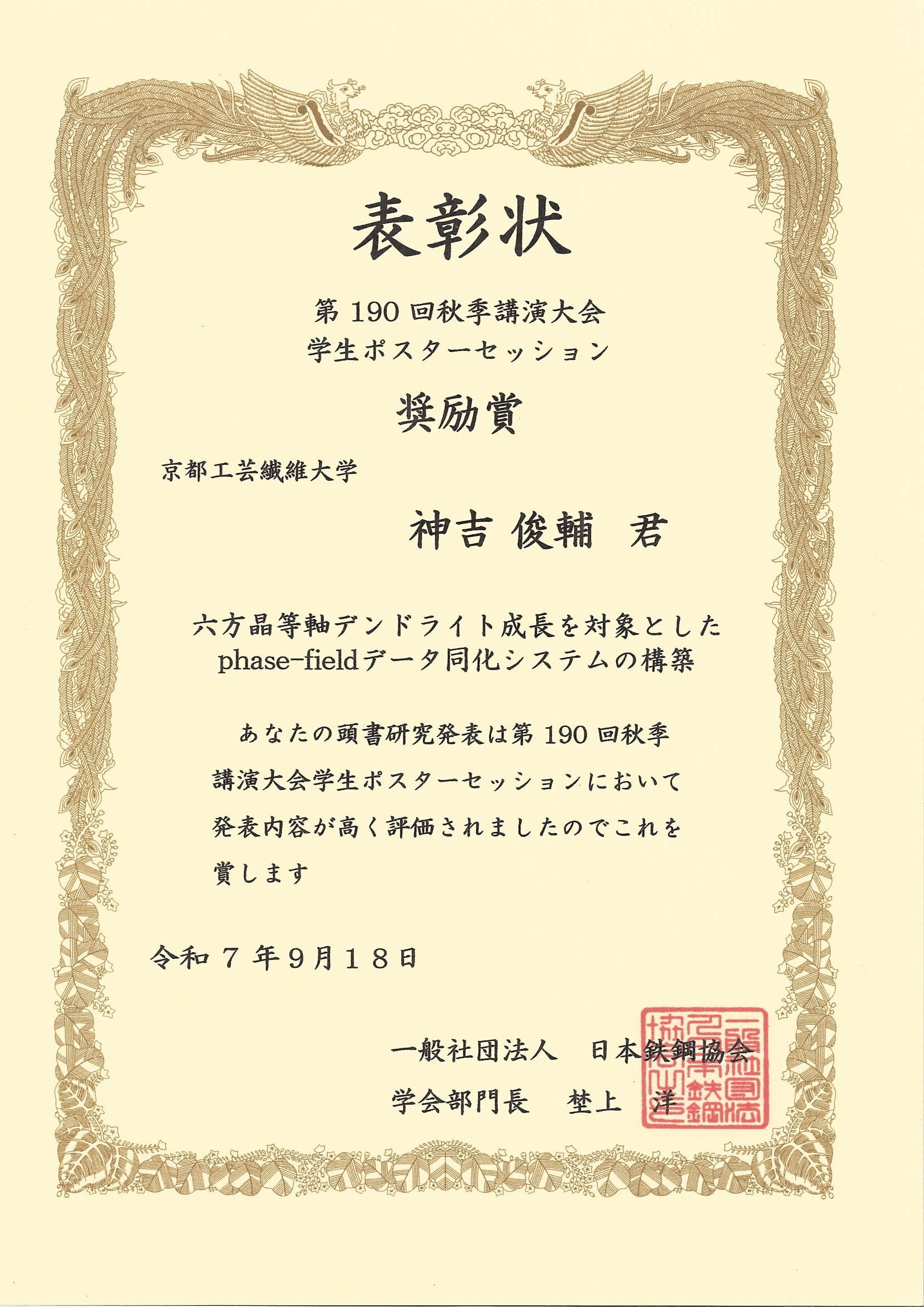 神吉俊輔君(修士2年生, 数値材料デザイン研究室) 日本鉄鋼協会第190回秋季講演大会学生ポスターセッション奨励賞 受賞課題「六方晶等軸デンドライト成長を対象としたphase-fieldデータ同化システムの構築」 2025年9月18日受賞賞状