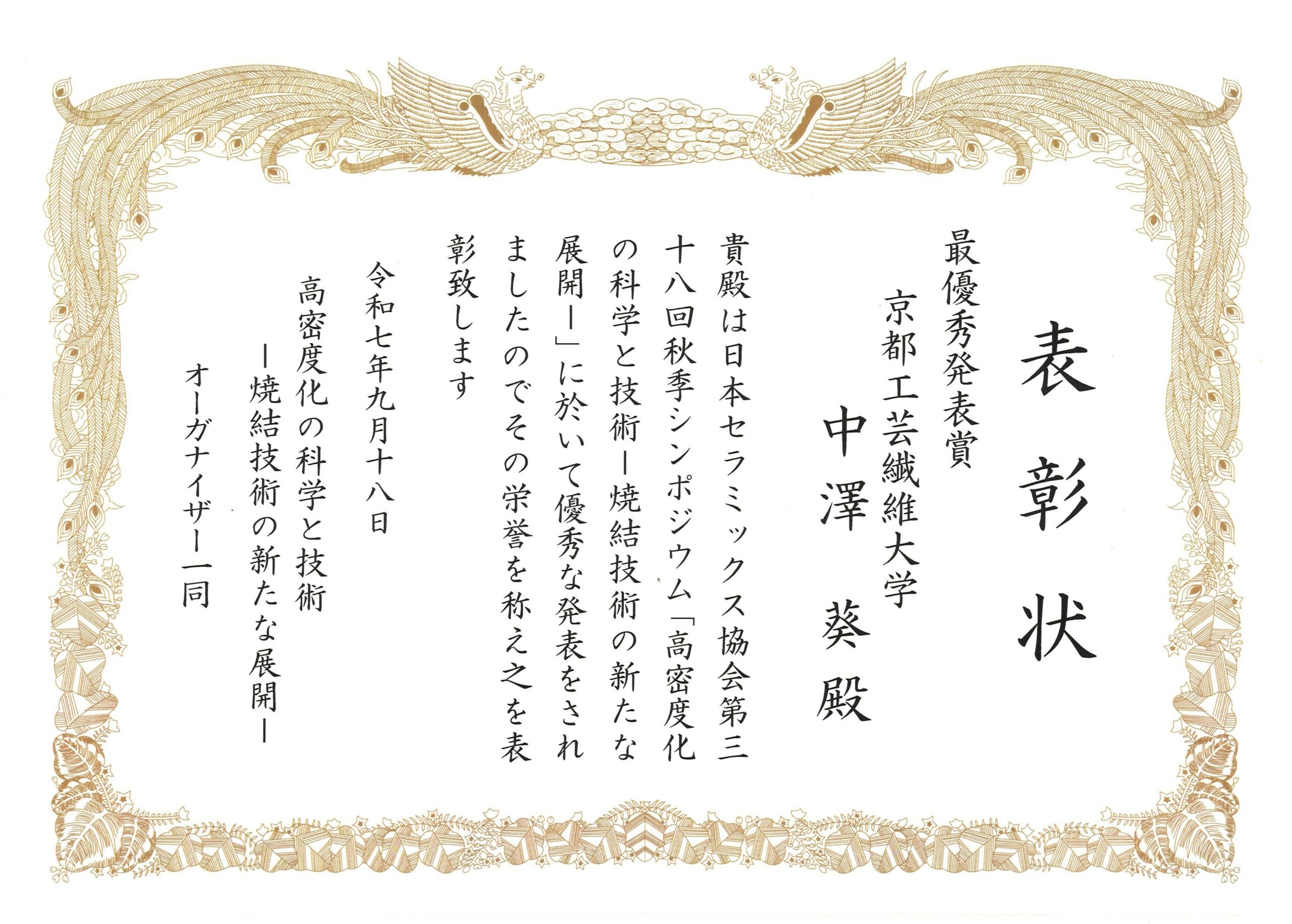 中澤葵君(博士1年生, 数値材料デザイン研究室) 日本セラミックス協会第38回秋季シンポジウム最優秀発表賞 受賞課題「Phase-field 法によるバルク焼結組織予測に向けた新しい計算手法の開発」 2025年9月18日受賞賞状