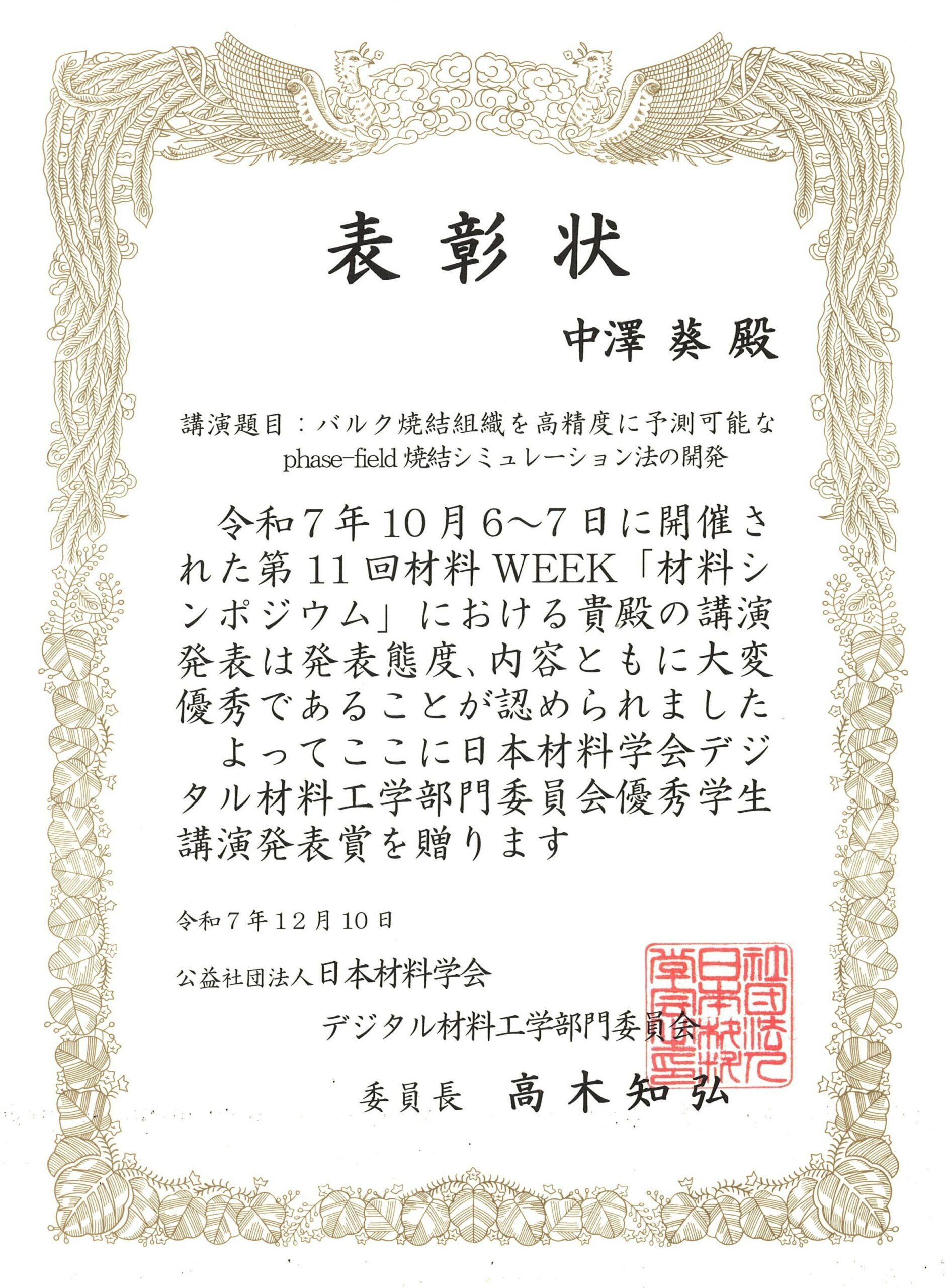 中澤葵君(博士1年生, 数値材料デザイン研究室) 日本材料学会デジタル材料工学部門委員会優秀学生講演発表賞 受賞課題「バルク焼結組織を高精度に予測可能なphase-field焼結シミュレーション法の開発」 2025年12月10日受賞賞状